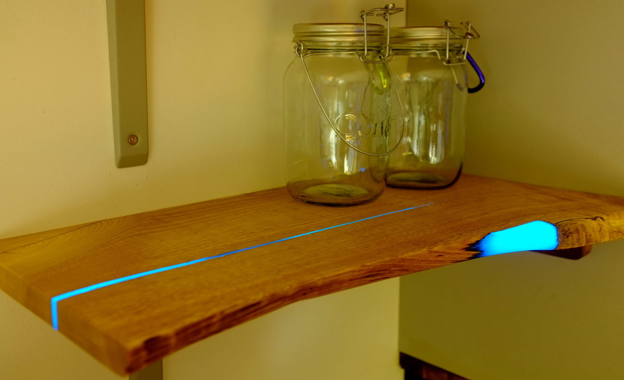 I recently came across these shelves by Mat Brown, they are amazing. Being a designer he has an eye for potential and so when he came across a piece of oak that was cracked and had woodworm he knew it would make beautiful shelves. He took this wood and filled the cracks with coloured resin, giving the whole thing a good sanding/oiling to finish. The colour in the resin glows in the dark, in the picture below you can see how luminous the resin looks.