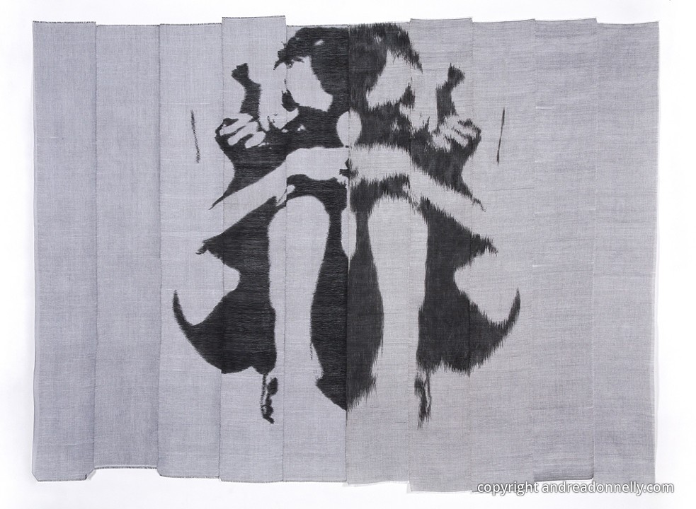 She also trained as a fine artist which shows in her other work where she puts imagery on to woven cloth. At first it seemed like she used an Ikat technique for this too but this is not the case. For her pieces of artwork she weave a plain fabric and paints the image on top of this while the warp is still attached to the loom. Once dried and fixed she then carefully deconstructs the weave back in to it’s original warp and weft before reweaving it back together. Sometime she uses entirely different images to put back together and other times she used this technique to create a mirror image, this is shown in her work looking at ink blots.