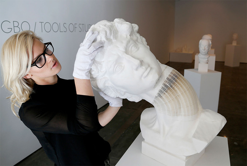 To make the sculptures he stencils glue on to large pieces of paper and layers the paper together, using thousands layers for each sculpture, until he has a big enough block and then carves out the desired sculpture. Carefully considering then the depth, width, mass, and centre of each piece to ensure it is stable, if the centre is slightly off it will fall over.