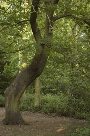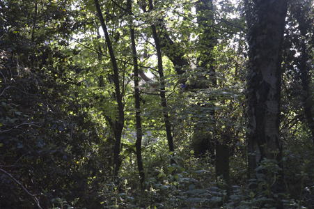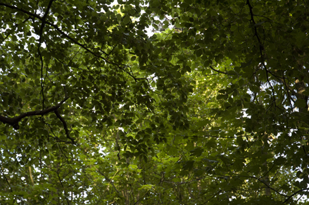 The light was adjusted in the dark wood to capture the bright green of the leaves above.